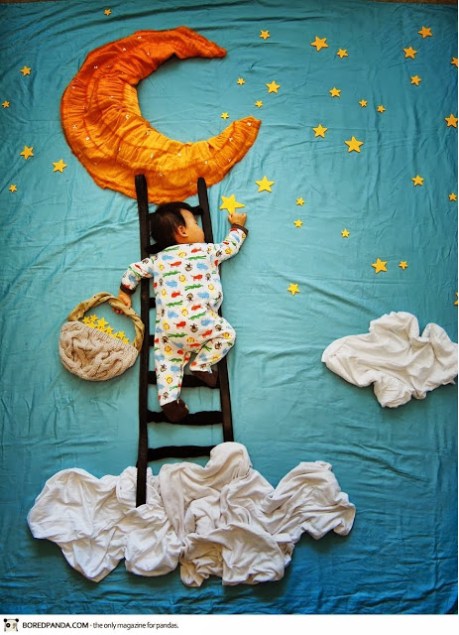 People inspire me every day by being creative, motivated or just positive when times are tough.Here’s some creative inspiration for you; artist Queenie Liao has produced these beautiful photographs of her child’s dreams by using basic household items such as sheets, books and teddies for the backgrounds.Using her imagination she has created magical fairytale-like scenes showing her baby’s journey through his dreams. Below are just a few from her album ‘Wengenn in Wonderland’ which is a collection of over 100 photos…