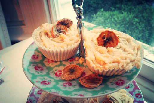 And voila, really easy, minimal effort but impressive homemade banana chips. Use to decorate the cupcakes and scatter extra chips on the plate.