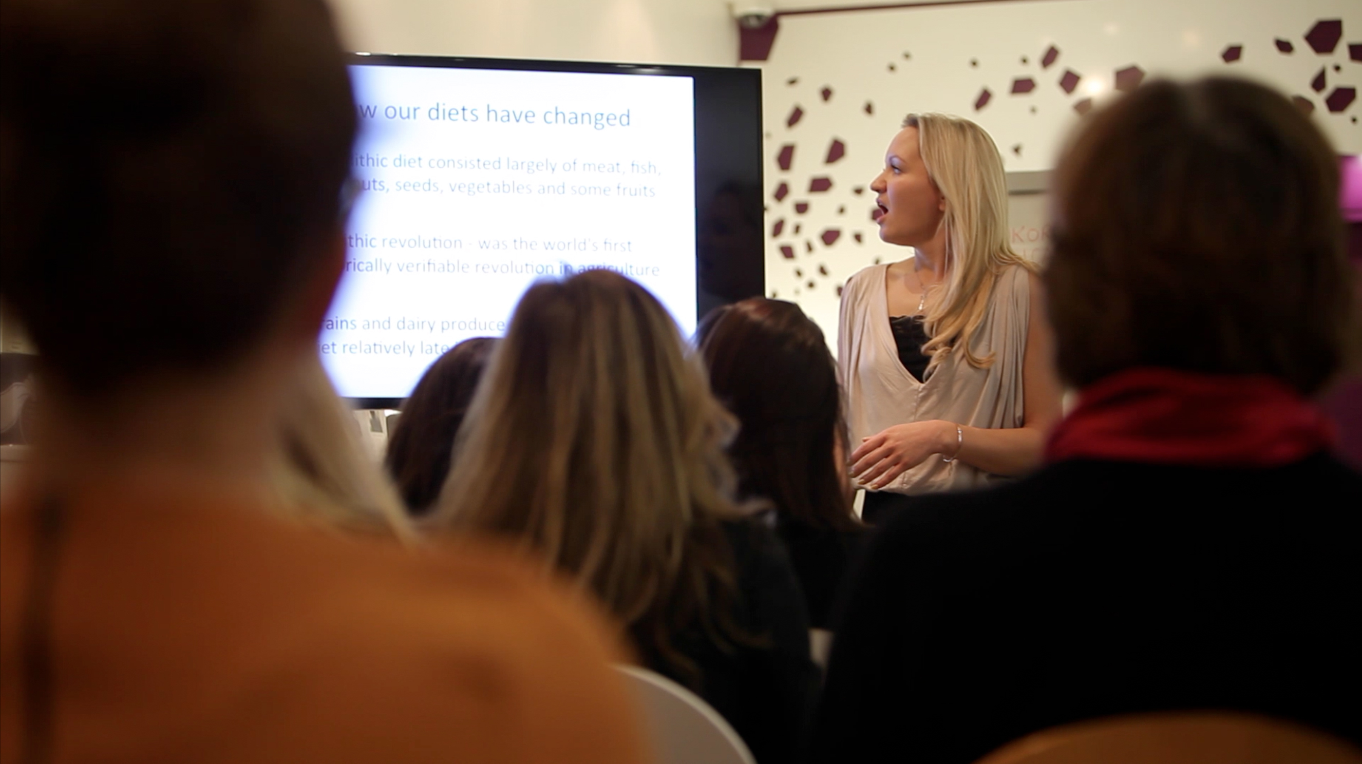 Kim began by really emphasising how unnatural gluten is (the word is derived from the Latin for ‘glue’ – enough said) starting with interested facts about what humans ate centuries ago – did you know that humans have only been eating wheat, aka gluten, in the last 10,000 years even though they have been around for about 10 million years!