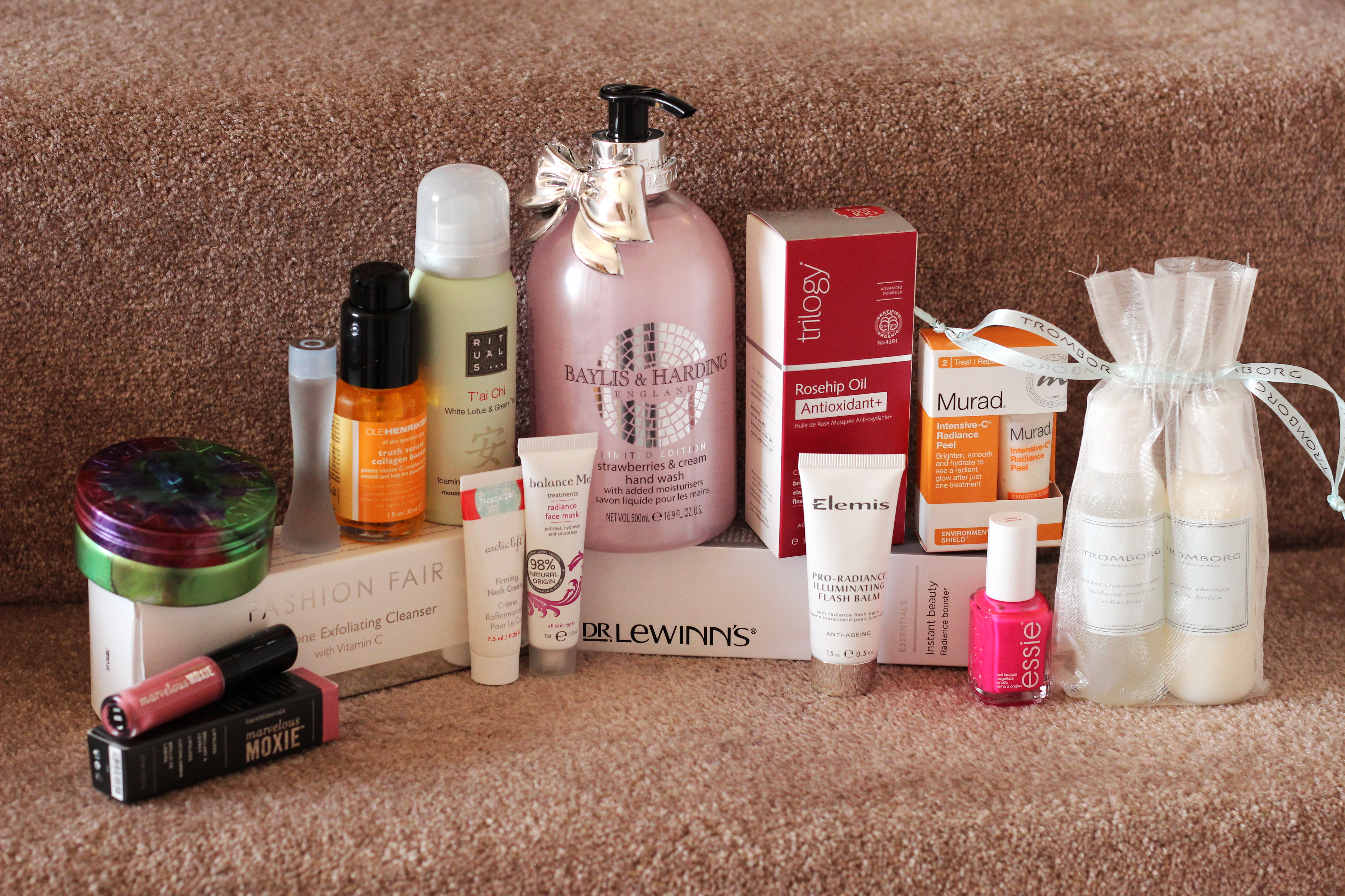 Steamcream (review here), bareMinerals Marvelous Moxie, Fashion Fair True Tone Exfoliating Cleanser, Ghost perfume, Ole Henriksen Truth Serum Collagen Boost, Rituals T’ai Chi White Lotus & Green Tea Shower Gel, Freeze24 Firming Neck Cream, balance Me radiance face mask, Baylis & Harding Strawberries & Cream, DR. Lewinns Instant Beauty Radiance Boost, Elemis Pro-Radiance Illuminating Flash Balm, triology Rosehip Antioxidant+, Murad Intensive C Radiance Peel, Essie Bottle Service, Tromborg Herbal Cleansing Water and Aroma Therapy Body Lotion